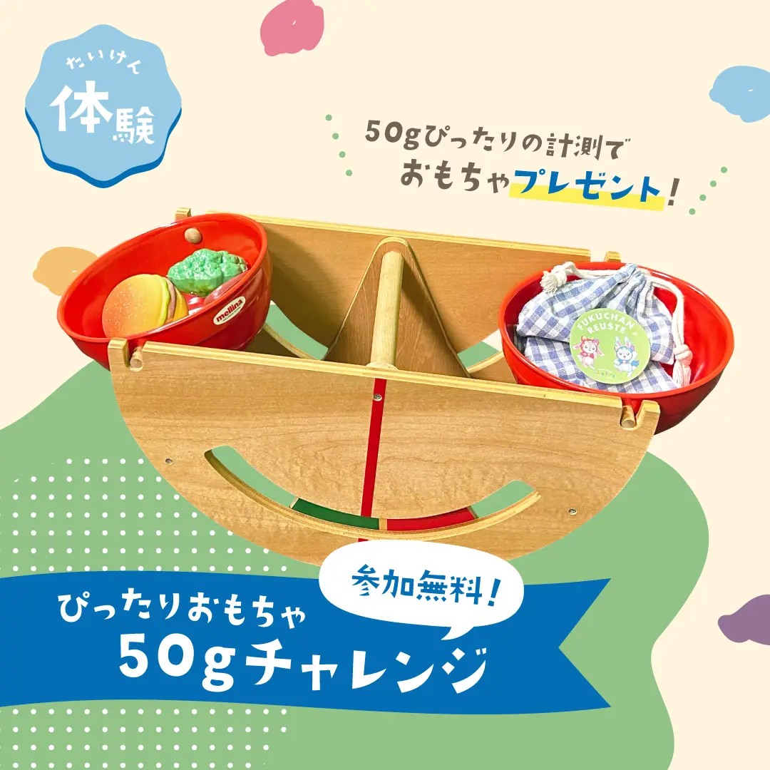昨年の人気企画を今年も開催!「ふくちゃんリユスタ」実店舗で好評の「おもちゃの量り売り」をモデルにした無料体験ブースです。片方に50gのおもりを乗せたてんびんのもう片方に好きなおもちゃを乗せ、ピッタリにできればそのおもちゃと「ふくちゃんリユスタ」公式キャラクター「りゆん&てすた」のお面をプレゼントします。